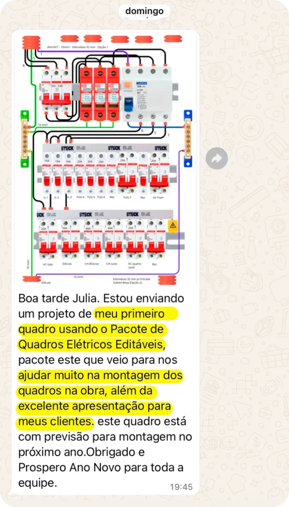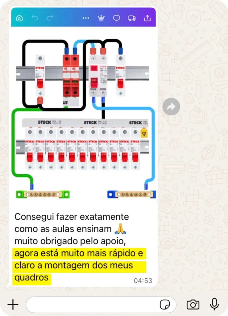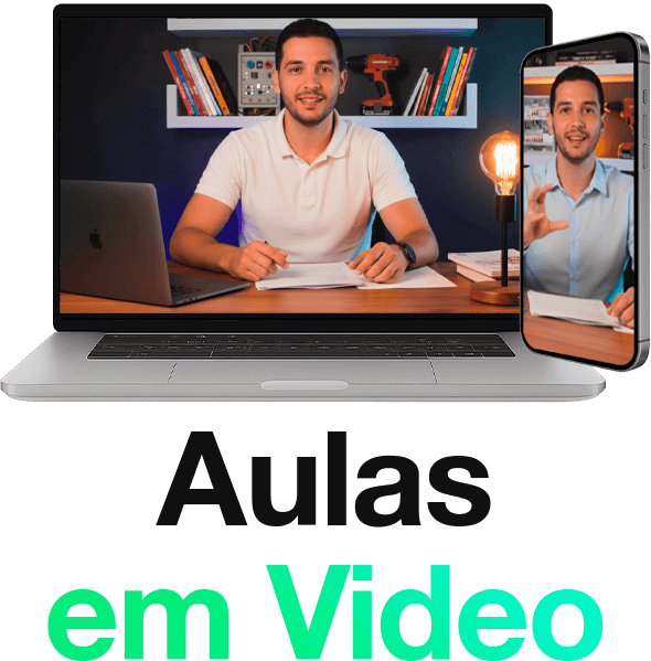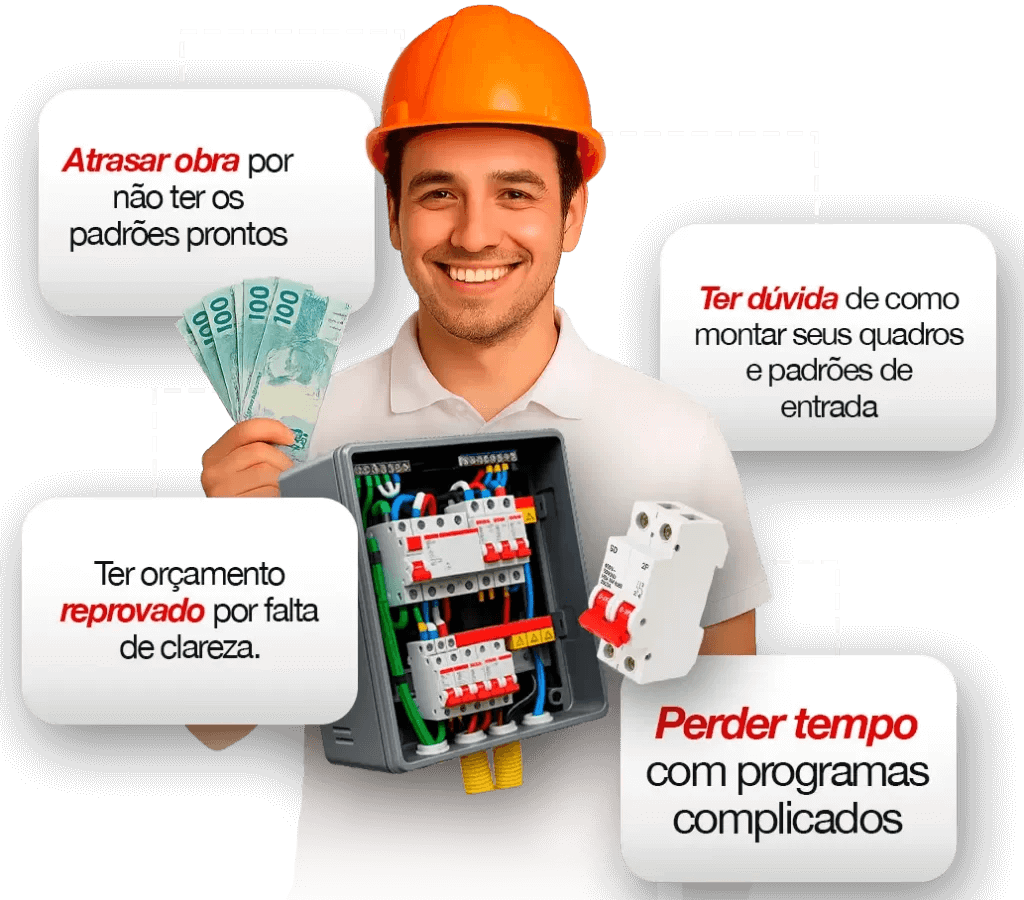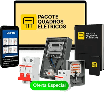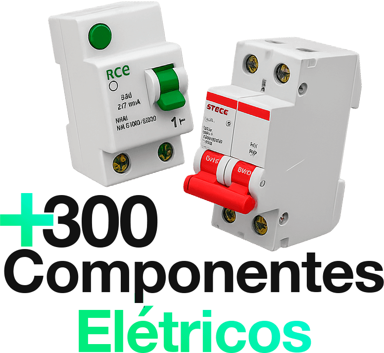 Você recebe mais de 300 componentes organizados por categoria (disjuntores, relés, contatores, bornes, canaletas, quadros, painéis e muito mais). Além disso, recebe os modelos prontos dos quadros e aulas gravadas mostrando como aplicar.
